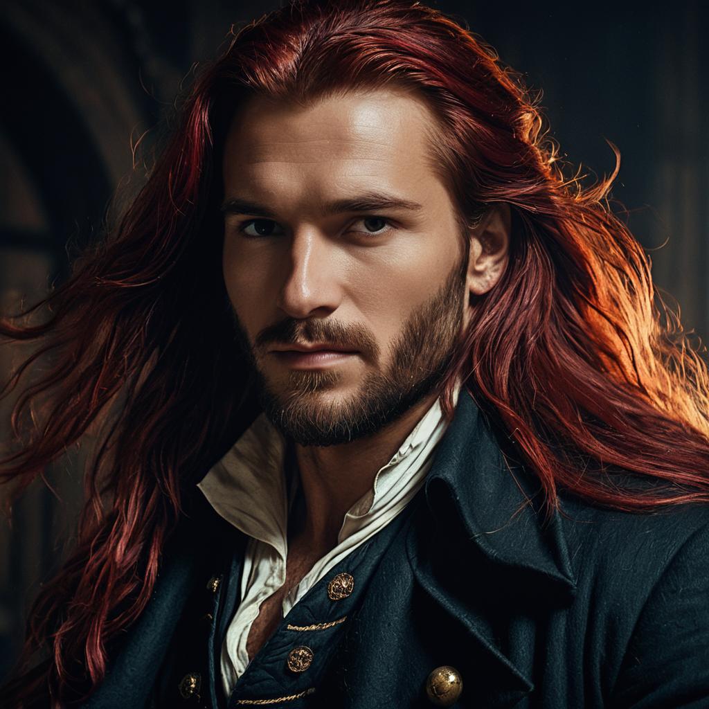 Close-up portrait of a muscular, rugged masculine man with long flowing crimson hair and a well-groomed beard. He is dressed in a 1920s period-styled elegant long coat with gold buttons over a partially open white shirt, exuding a seductive and cinematic aura. The lighting emphasizes his strong facial features and soft flowing hair, capturing a dramatic and vintage pirate look.