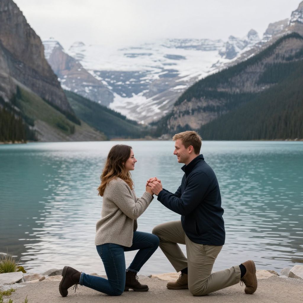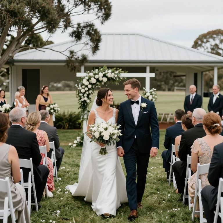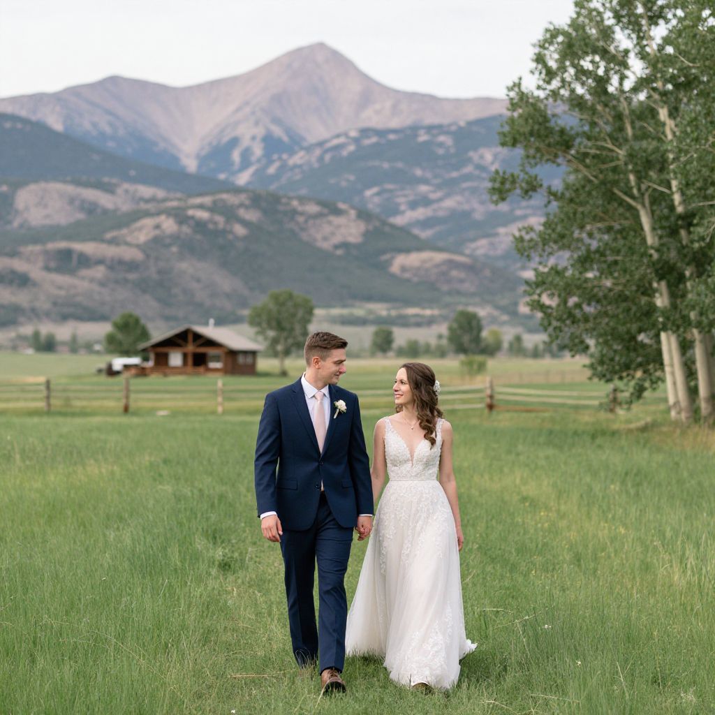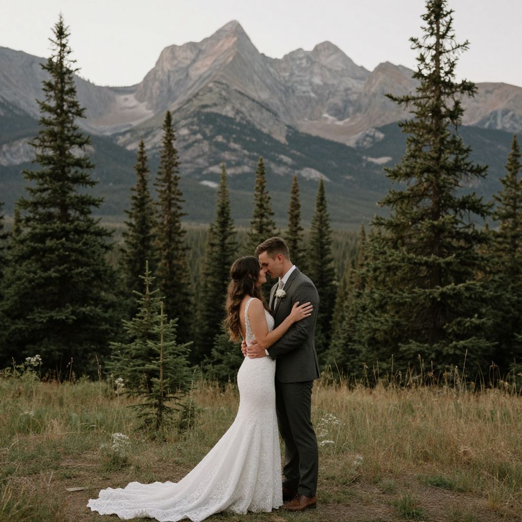 Photograph of an outdoor wedding ceremony with mountain backdrop, bride in white gown kissing groom in black suit, surrounded by guests.