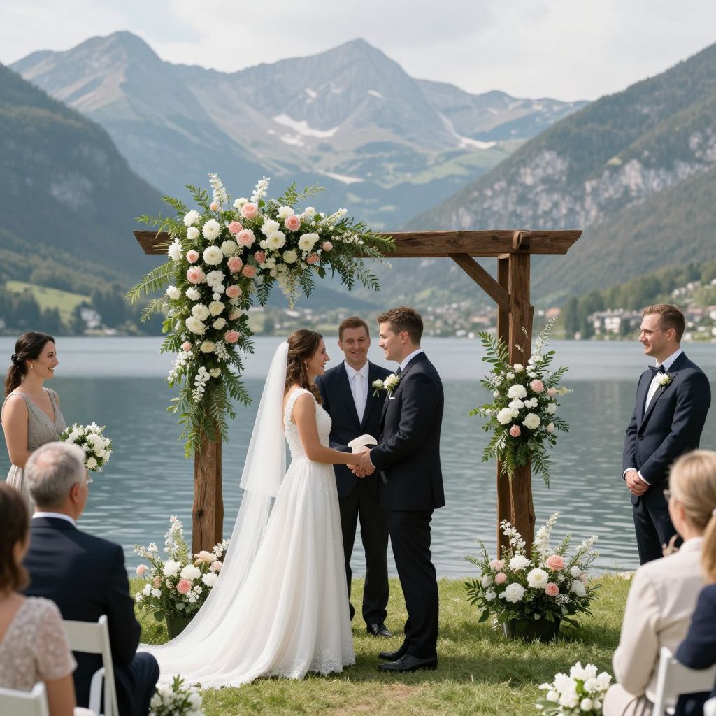 Photograph of an outdoor wedding ceremony set against a majestic mountain range with snow-capped peaks. The bride and groom, standing under a wooden arch adorned with white and pink flowers, share a kiss. The bride wears a white, sleeveless lace gown with a long veil, while the groom is in a black tuxedo. Two bridesmaids in black dresses stand to the left, and two groomsmen in black tuxedos are to the right. Guests in formal attire sit in wooden chairs on the grassy field. The background features green hills and a dense forest. The sky is overcast.