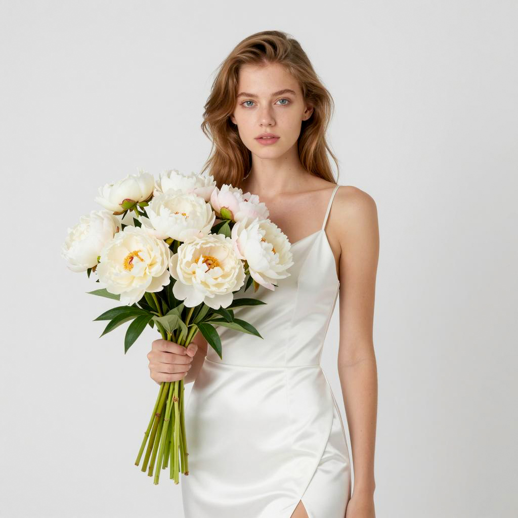 Photograph of a young woman with light brown hair and blue eyes. She wears a white satin dress with thin straps and a side slit. She holds a large bouquet of white peonies in her right hand. Her expression is neutral. The background is plain white. She is centered in the frame, looking slightly to the left. Her left arm rests at her side. The peonies fill the left half of the image.