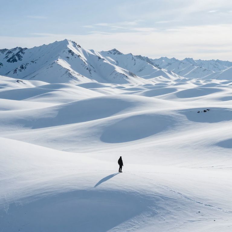 A solitary figure stands before a vast, undulating landscape of pristine snow, where the mountains appear to flow like liquid ice, defying gravity and reshaping the horizon in an otherworldly dance.