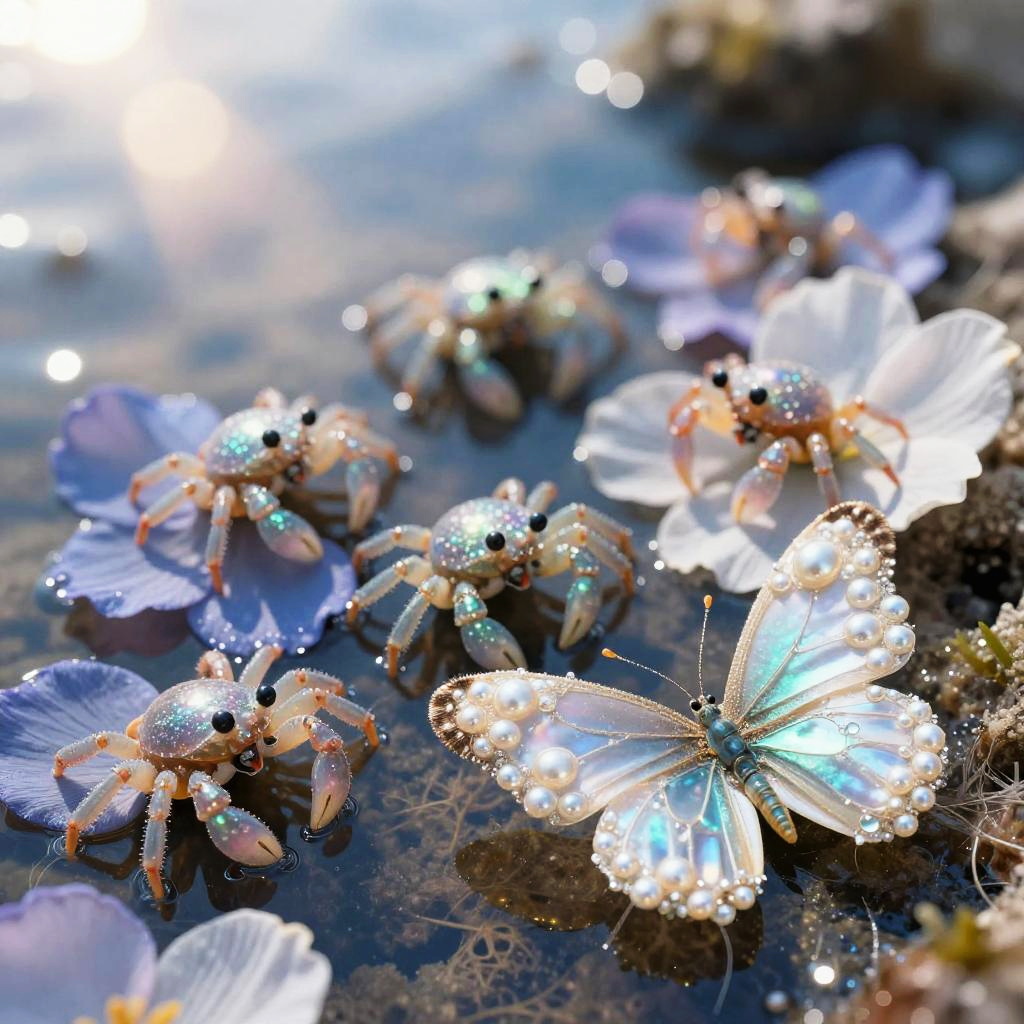 Celestial sapphire tidepools beneath sparkling noon sun, endearing small iridescent tide sprite crabs prancing among petals, a butterfly in the foreground formed from pearl shimmer fiber threads, dewdrops glitter, intricate textures, iridescent colors, macro realism, magical realism, hyperrealistic, volumetric light, soft bokeh, tactile details, storybook yet believable, 8k clarity