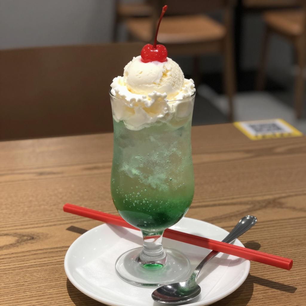 A photograph of a glass filled with green, bubbly liquid topped with white ice cream and a red cherry. The glass is on a white plate with a red chopstick and a silver spoon. The background shows a blurred indoor setting with brown furniture. The glass is centered on a wooden table.