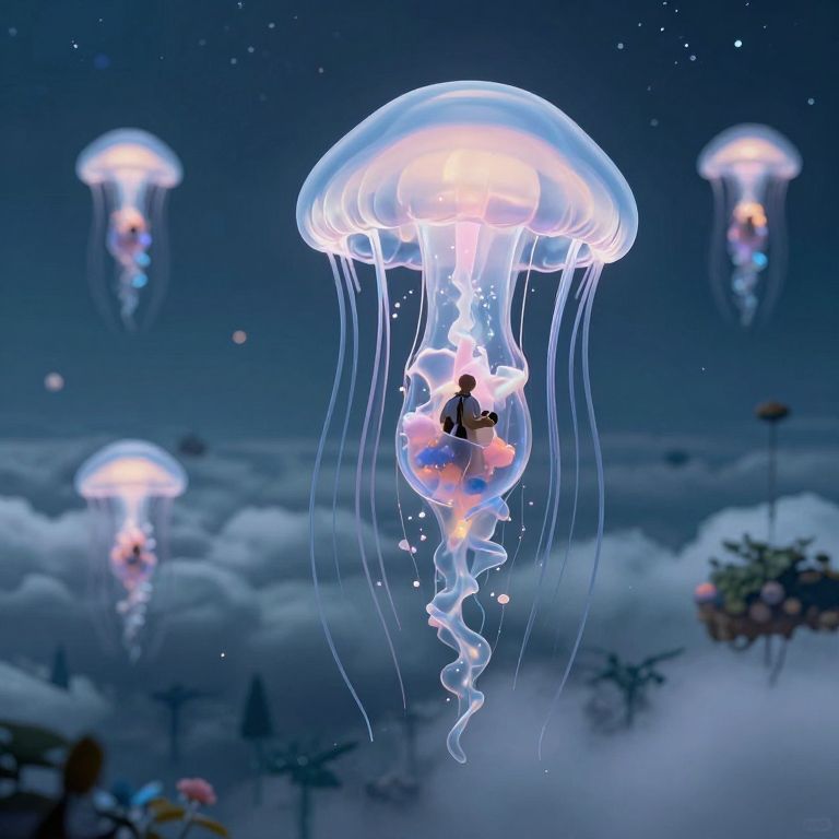 Giant, airborne jellyfish carry tiny civilizations in their bell pockets, trading memories and dreams across floating cloud-mesa realms.
