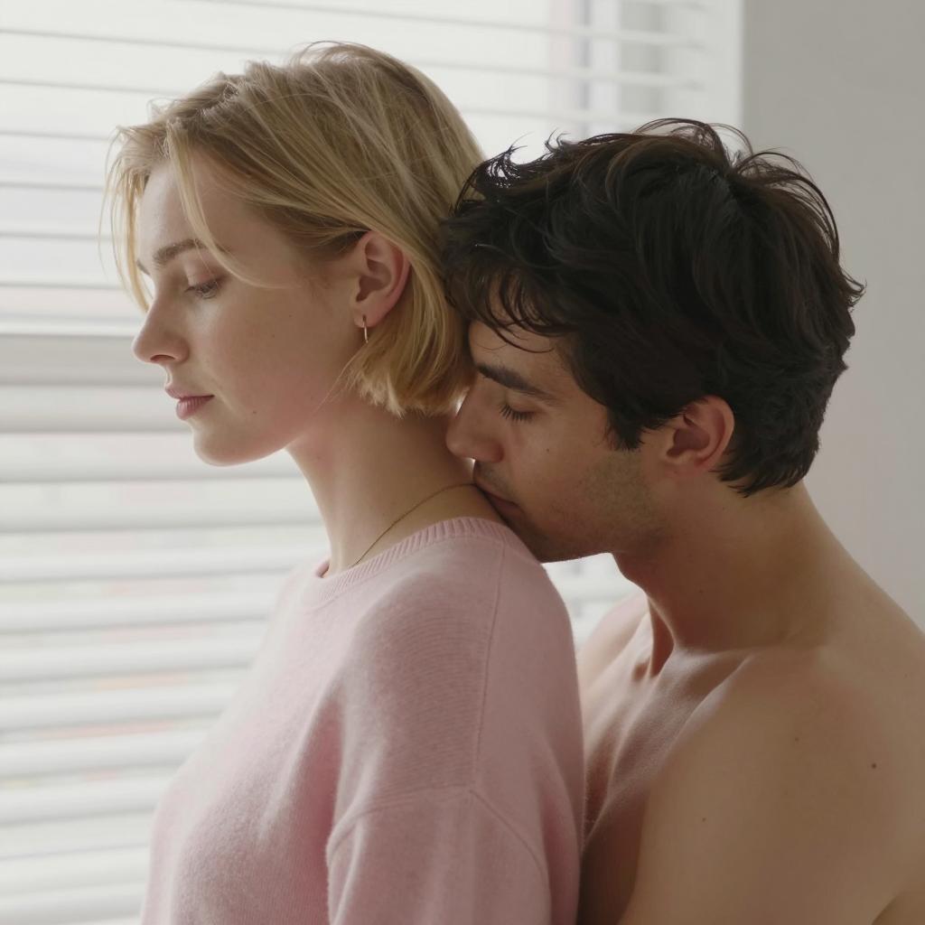 A photograph of a topless woman with light brown hair, eyes closed, being hugged from behind by a man with dark hair. Her right arm is wrapped around his back. Dim, warm lighting. Background is dark and blurred.