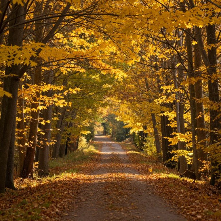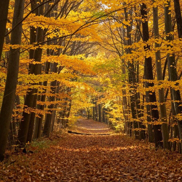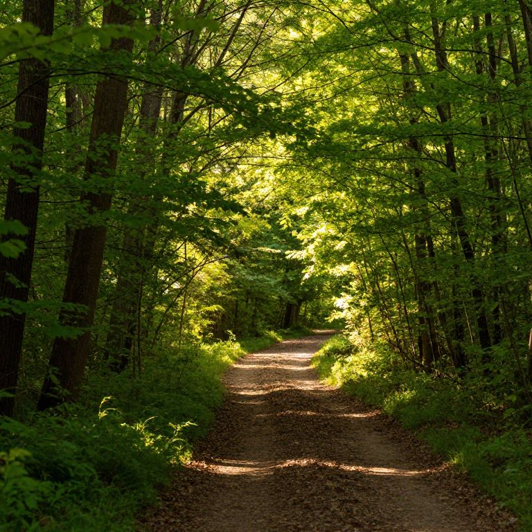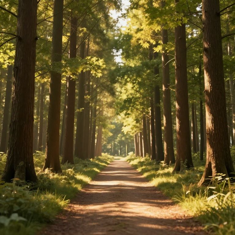 Sunlight filters through dense green foliage, casting a golden glow along a winding dirt path flanked by towering trees and lush undergrowth in a serene forest.