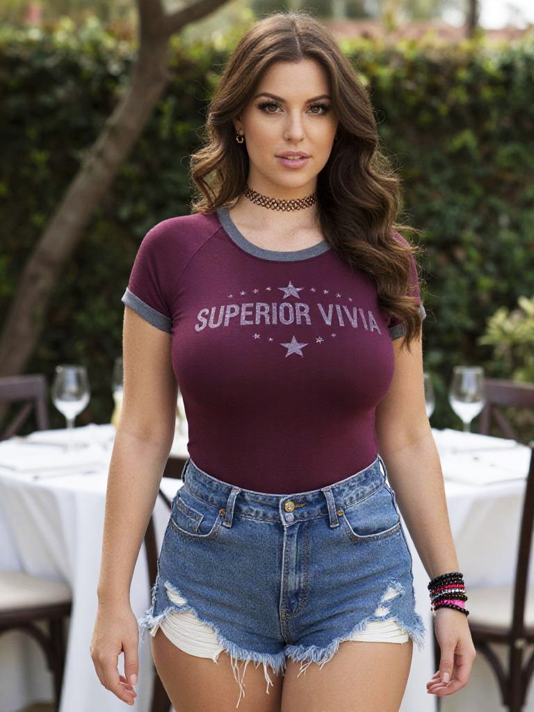 A curvy woman in a maroon and grey raglan t-shirt with Superior Varsity print and frayed denim shorts stands in a wine tasting garden, adorned with a choker necklace and multiple bracelets on one wrist, her wavy hair flowing freely. Visual style: Juan Francisco Casas Ruiz. Sexy. Pretty face and beаutiful eyes. Big breasts