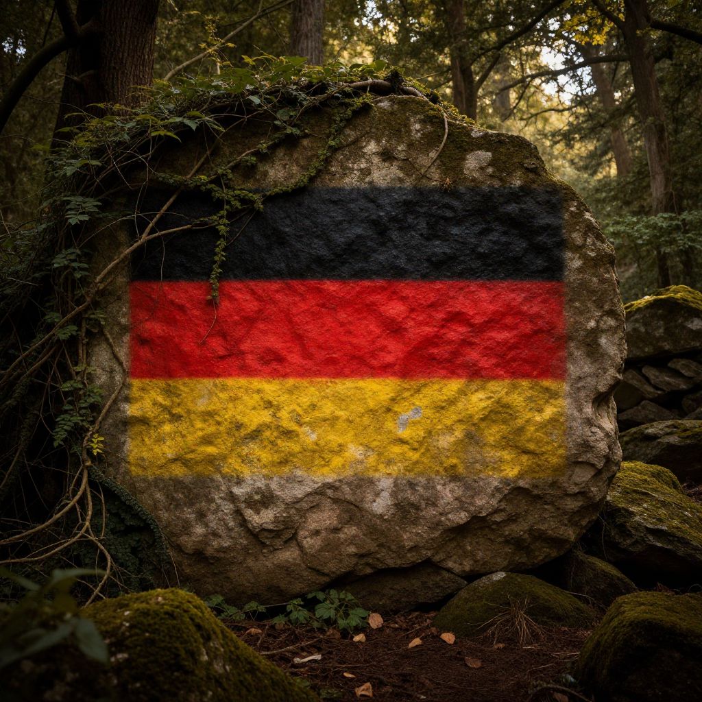 A photograph of a large, round, moss-covered stone in a forest, painted with the German flag's colors: black, red, and yellow horizontal stripes. The stone's rough texture contrasts with the vibrant, slightly weathered paint. Sunlight filters through the dense trees in the background, casting dappled shadows on the ground and the stone. Surrounding the stone are various forest plants and moss, adding to the natural, rustic setting. The image has a vivid, slightly surreal quality with high contrast and rich colors.
