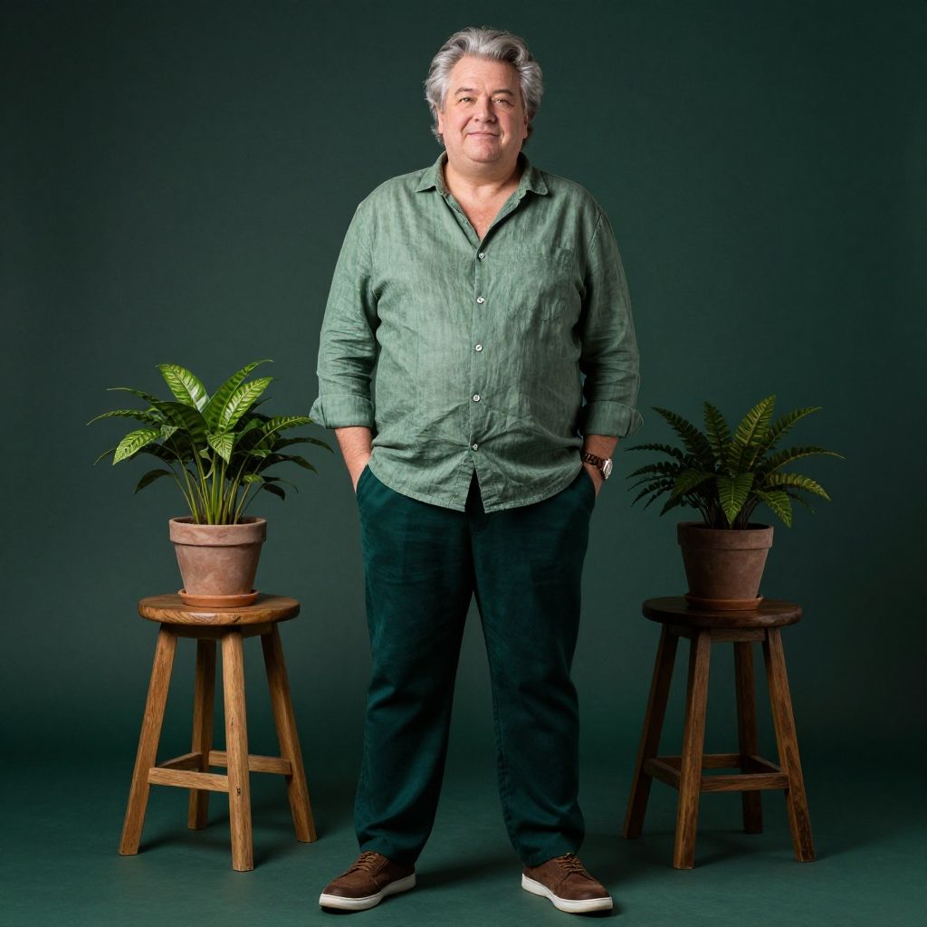 Portrait of a relaxed mature man with gray hair and heavy build wearing a green linen shirt and dark emerald pants. He stands confidently against a dark emerald studio background with hands in pockets, flanked by two wooden stools holding potted plants.
