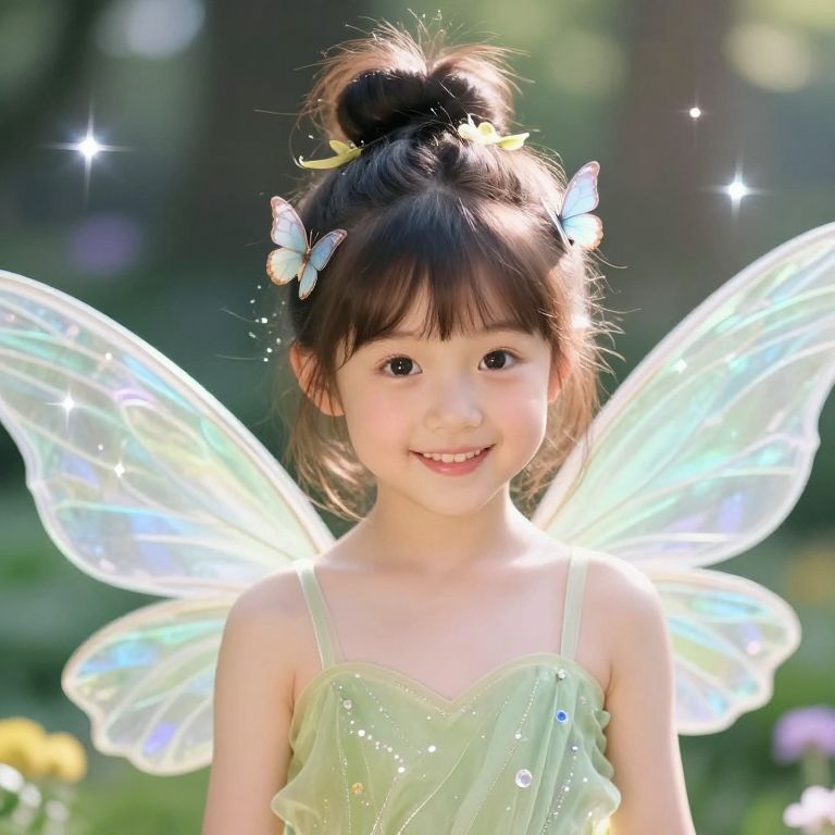 A beautiful fairy girl with big, sparkling eyes and a radiant smile, adorned with butterfly clips and fairy wings, stands in a magical, twinkling fairytale background, reminiscent of Tinker Bell's enchanted world.