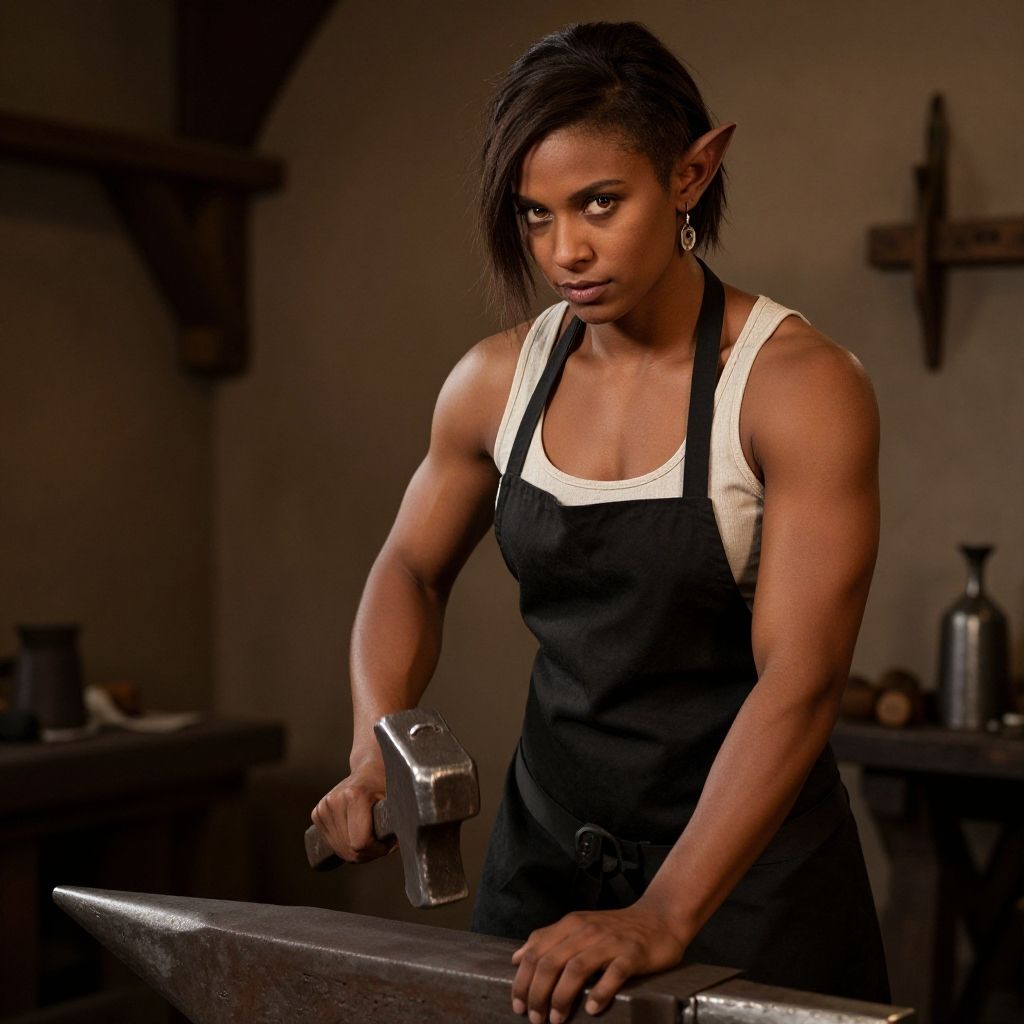 Photograph of a muscular Black woman with dark skin and pointed elf-like ears, standing in a dimly lit blacksmith's workshop. She has short, sleek black hair and wears a white tank top with a black apron, revealing her toned arms and shoulders. She holds a hammer in her right hand, resting it on an anvil. Her expression is focused and determined. The background includes blurry wooden shelves and tools. The lighting highlights her muscular definition and the texture of the anvil. The overall scene conveys strength and determination in a traditional craftsmanship setting.