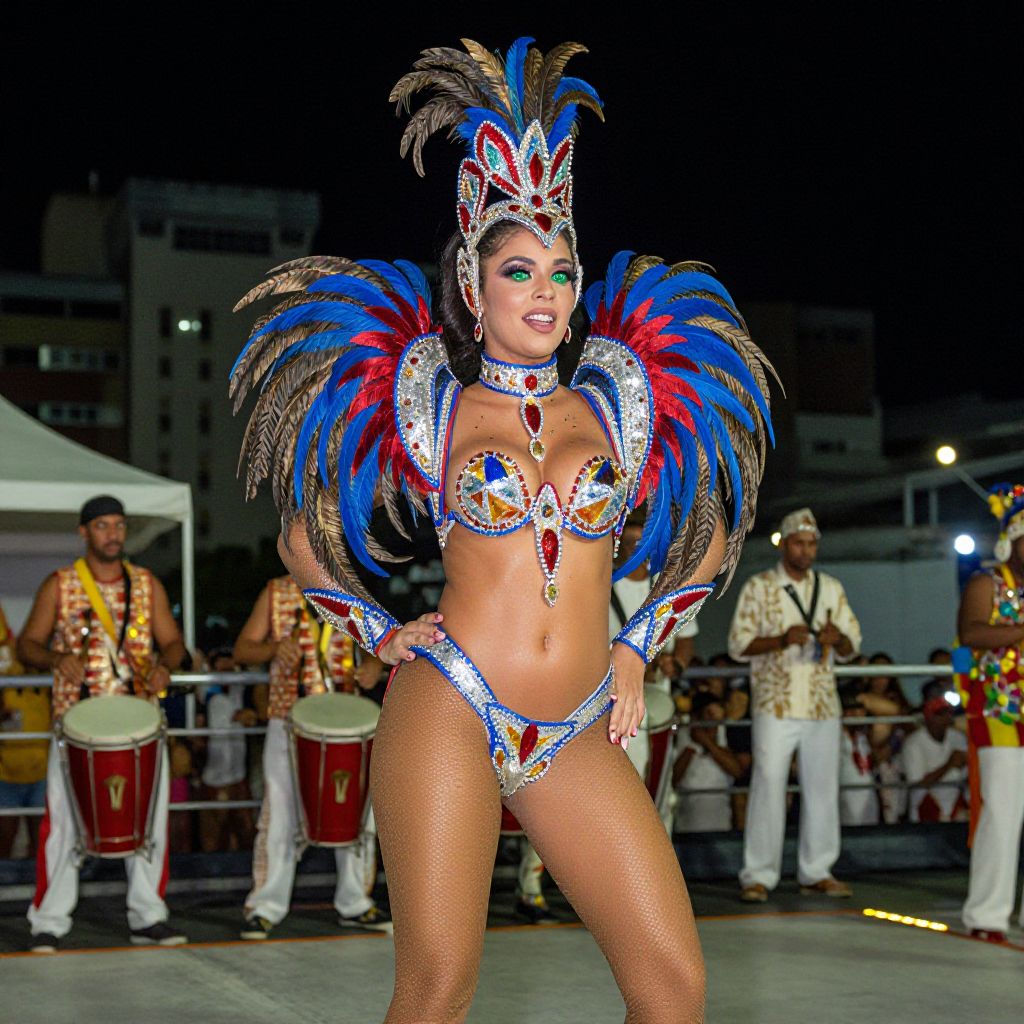 A glamorous showgirl in a Rio carnival costume with bold samba sequins, intricate feather patterns in blue, red, and silver, wearing a high-riding bustle and a feathered headdress, performing on a rooftop stage during a nighttime festival in Copacabana; she has a statuesque frame, sharp features, a defined jawline, and lively green eyes, illuminated by flashing lights and distant samba drums echoing in the air.
