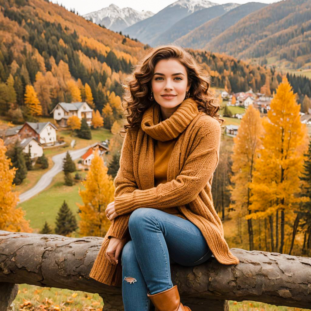 Portrait of a petite woman with retro curls wearing a cozy ochre cashmere sweater, blue denim jeans, and brown leather boots. She is seated on a stone bench surrounded by autumn leaves, with a scenic mountain valley and colorful fall foliage in the background.