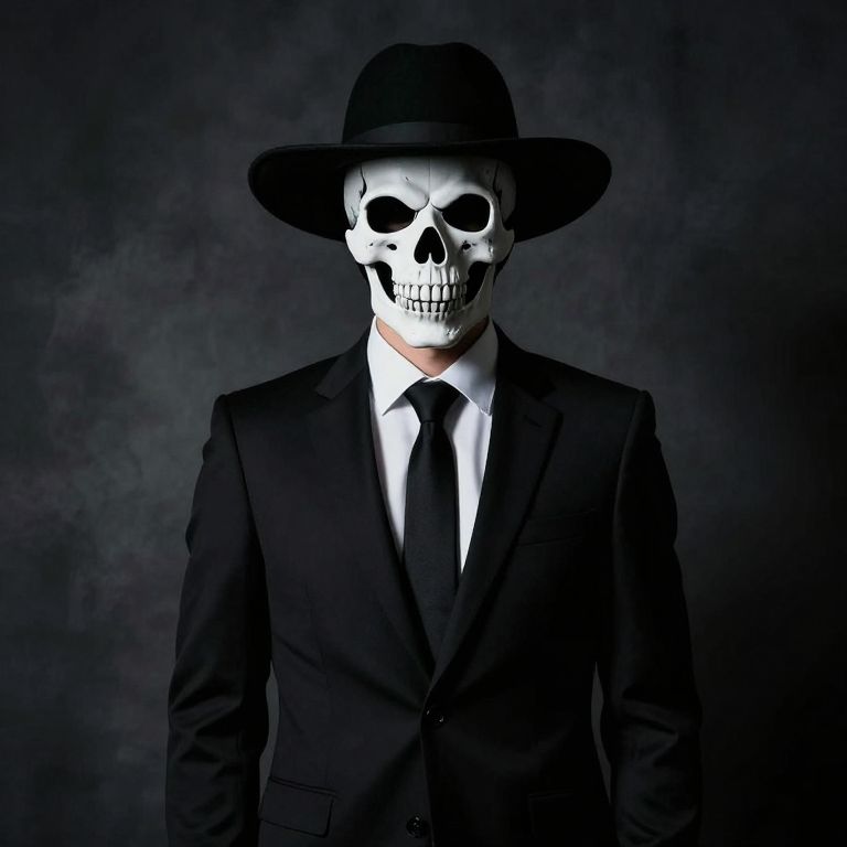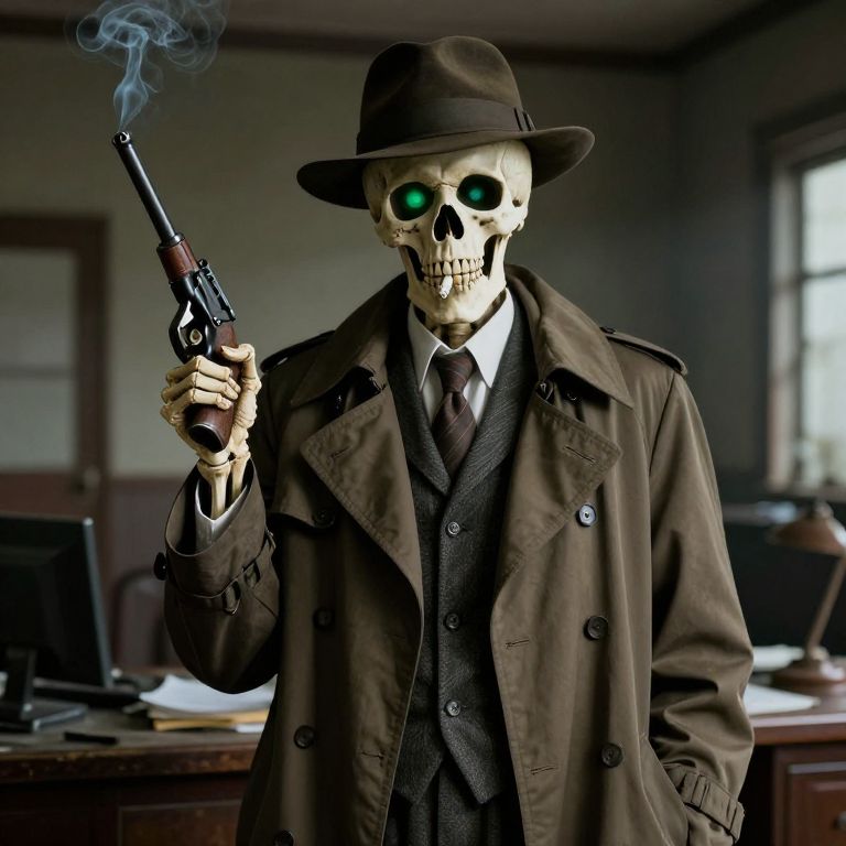 Photorealistic digital art of a skeletal figure wearing a brown fedora, dark brown overcoat, and matching three-piece suit, standing in a dimly lit, old-fashioned office. The skeleton's hollow green eyes glow, and it holds a smoking revolver in its right hand. A wooden desk with papers and a window with blurred light in the background complete the scene. The contrast between the eerie skeleton and the vintage office setting creates a mysterious, gothic atmosphere.
