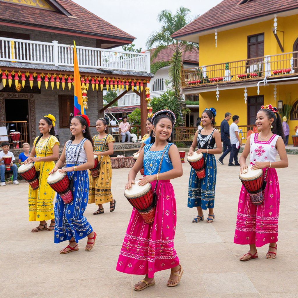 Photograph of vibrant Filipino women in colorful traditional dresses and headscarves, dancing and playing drums in a sunny village courtyard.