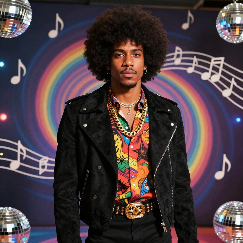 Disco Soul Train 70s black fashion inspired portrait of a stylish individual with a large afro, gold chains, suede jackets with wide lapels, and vibrant printed shirts, standing confidently amid a swirling psychedelic backdrop filled with musical notes and disco lights.