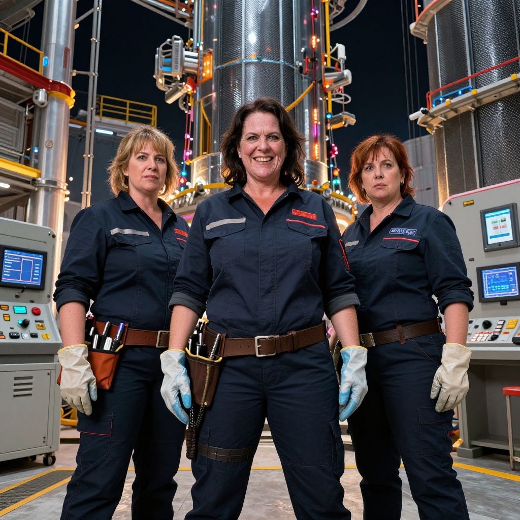 Photograph of three women standing in a brightly lit industrial control room. The central woman, with curly dark hair and a broad smile, wears a black shirt with red patches, brown belt, and white gloves. Flanked by two women with blonde and brown hair, respectively, both in similar black shirts and brown belts, they stand confidently. Behind them are tall metallic cylinders, control panels with illuminated screens, and a complex network of pipes and cables. The setting has a modern, high-tech feel with a mix of yellow, red, and blue accents.
