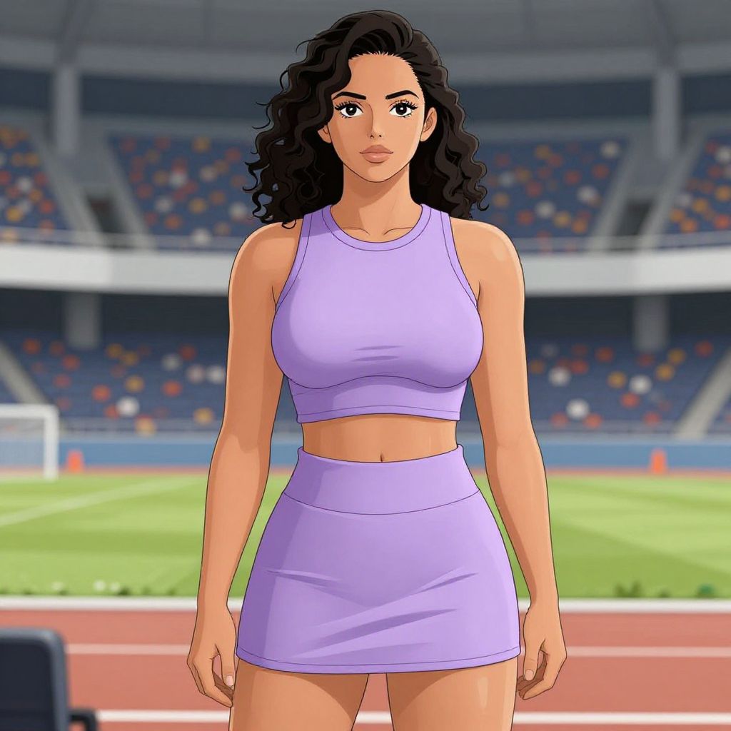 Digital illustration of a curvy, tan-skinned woman with black curly hair, wearing a lilac crop top and matching skirt, standing in a stadium