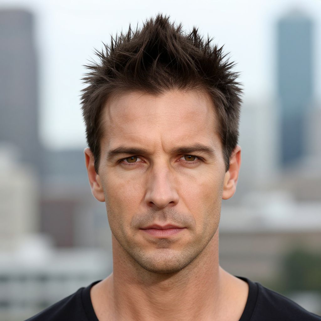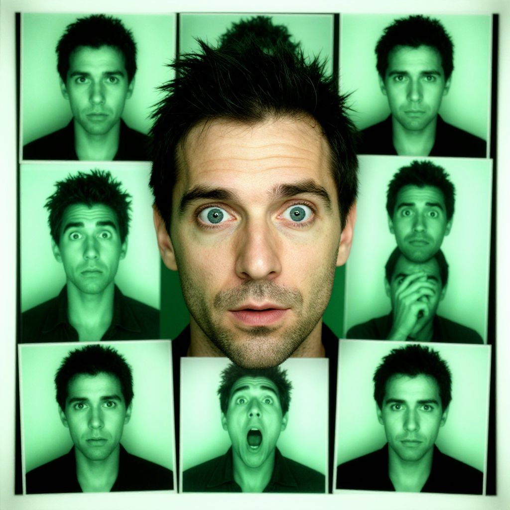 Photograph collage of a man with spiky black hair, green-tinted, displaying various expressions: neutral, surprised, wide-eyed, shocked,