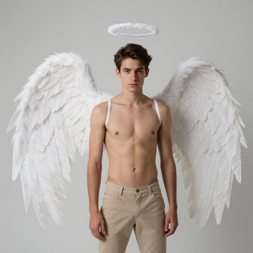 Fallen angel costume male, wings, solo, 1boy, angel wings, male focus, realistic, angel, feathered wings, looking at viewer, white wings, old