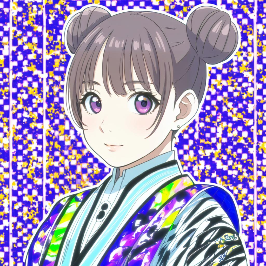 Munakata atsumi, idolmaster, 1girl, purple eyes, brown hair, short hair, double bun, by artist shiina excel, anime