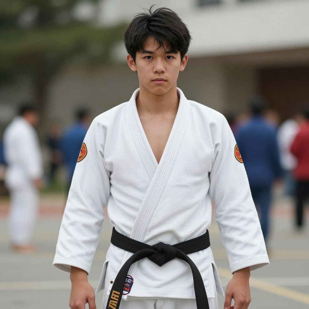 Photograph of a young Asian male standing outdoors in a martial arts setting. He has short, black, slightly messy hair and a serious expression. He wears a white gi with a black belt tied at the waist, featuring a red and yellow patch on the left sleeve. The background is blurred, showing other martial artists in white gis and indistinct buildings. The ground has yellow and red lines, suggesting a training area. The image has a sharp focus on the young man, with a shallow depth of field.