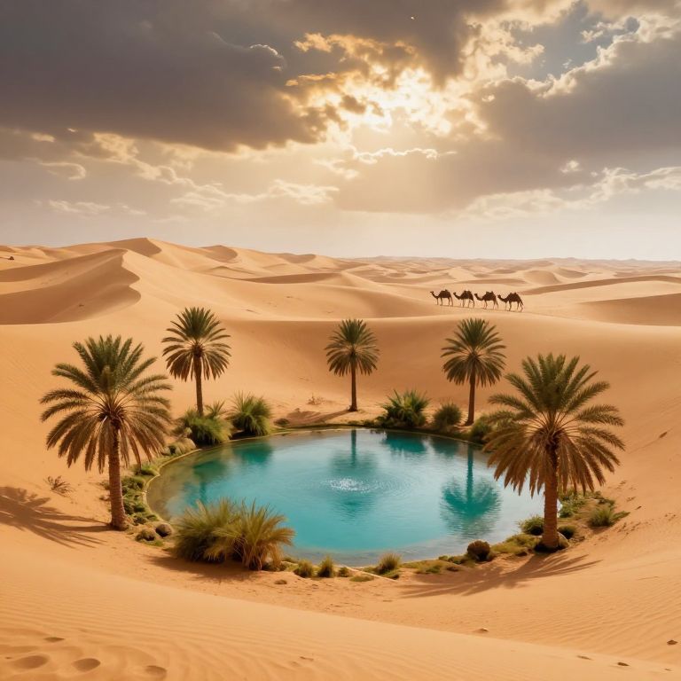 Exotic desert oasis with palm trees and turquoise water surrounded by towering golden dunes, a caravan of camels in the distance under a dramatic sky with swirling clouds, warm hues and soft lighting, cinematic and painterly style with epic scale