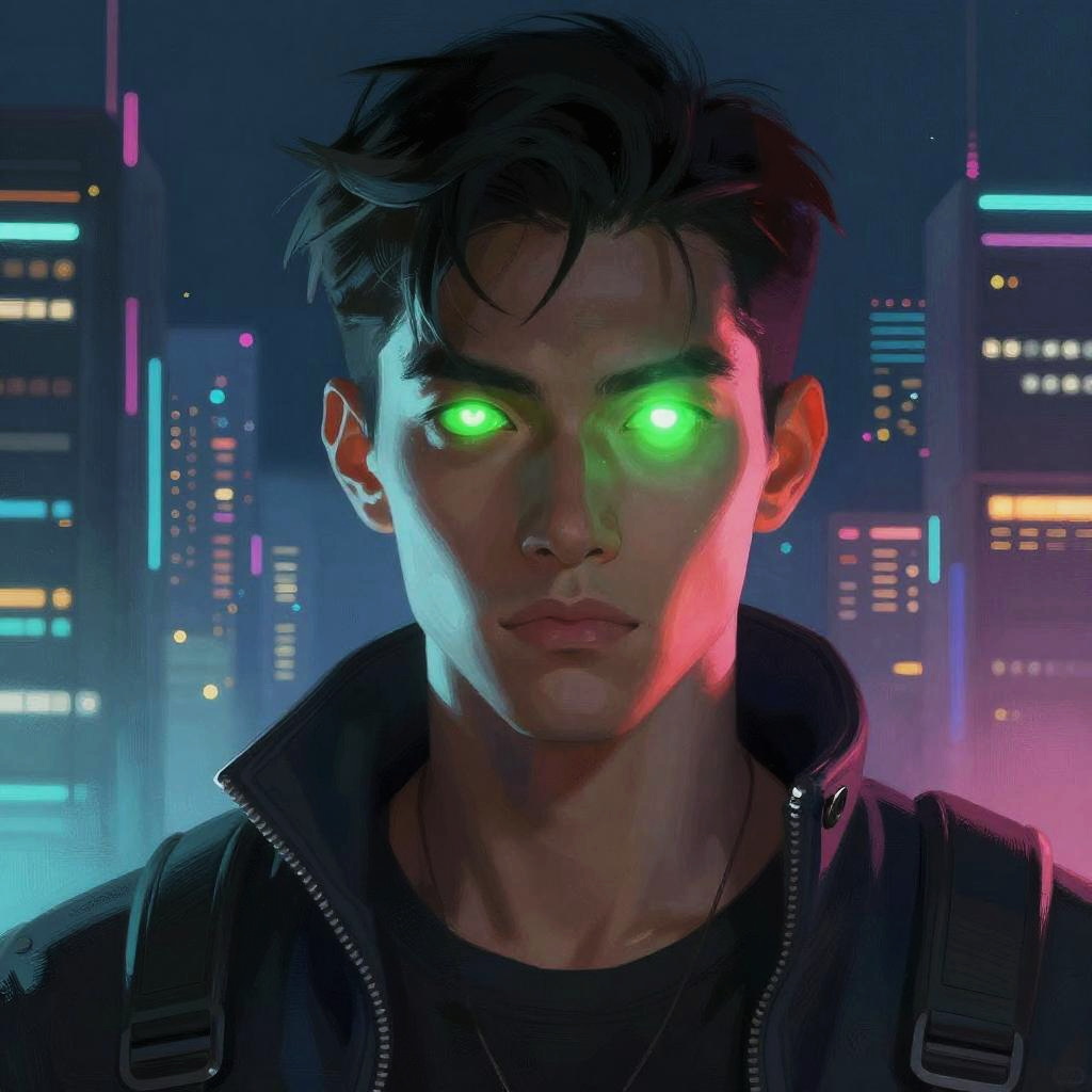 Digital artwork of a serious, dark-haired man with glowing green eyes, wearing a black jacket, against a neon-lit cityscape at night.