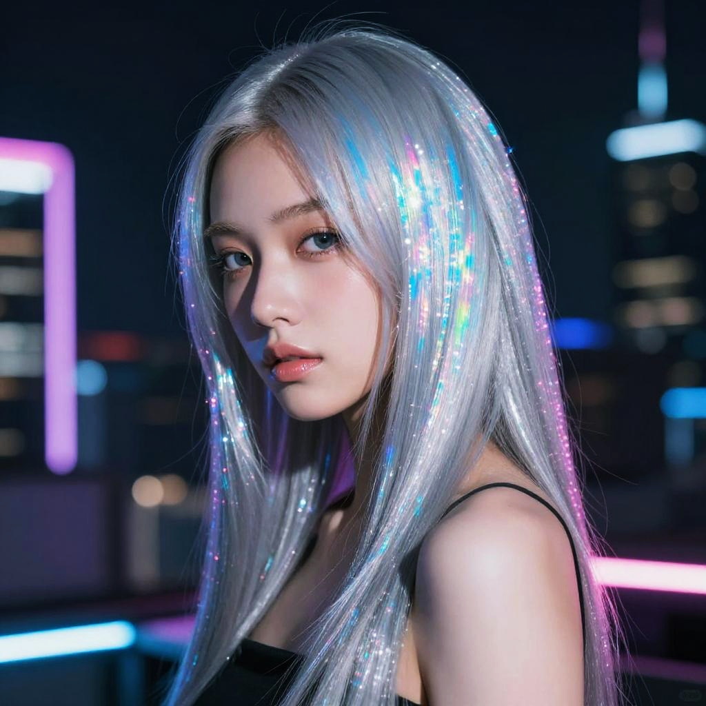 Change my hair color to shimmering silver with icy blue undertones, styled sleek and straight, illuminated by neon city lights with a futuristic cyberpunk vibe and holographic reflections.