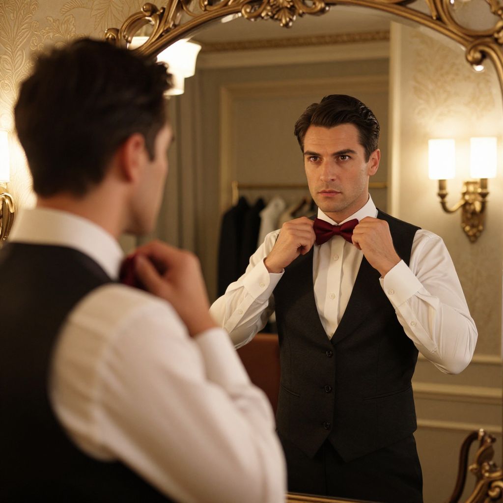 A dapper gentleman adjusting a bold red bowtie in front of a large antique mirror in a luxurious dressing room, warm ambient lighting creating a dramatic and sophisticated atmosphere, high fashion editorial style