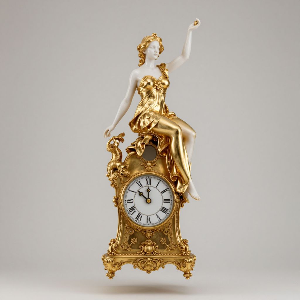 A golden, ethereal figure of timeless elegance perches serenely atop a majestic mantle clock, defying gravity as if suspended between realms of art and time.