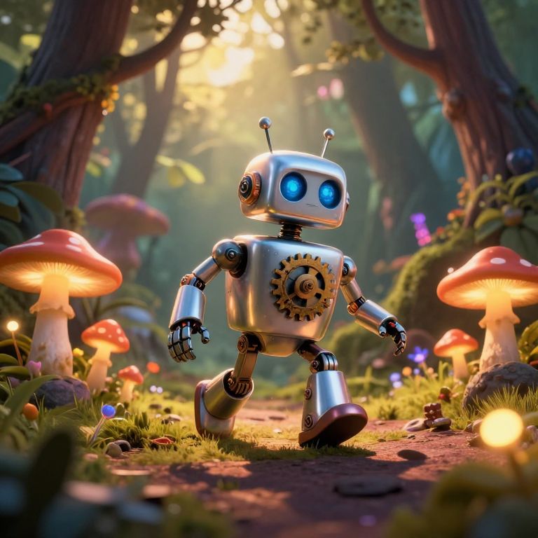 CGI image of a shiny silver robot with blue glowing eyes, walking through a magical forest with glowing mushrooms and sunlight filtering through trees.