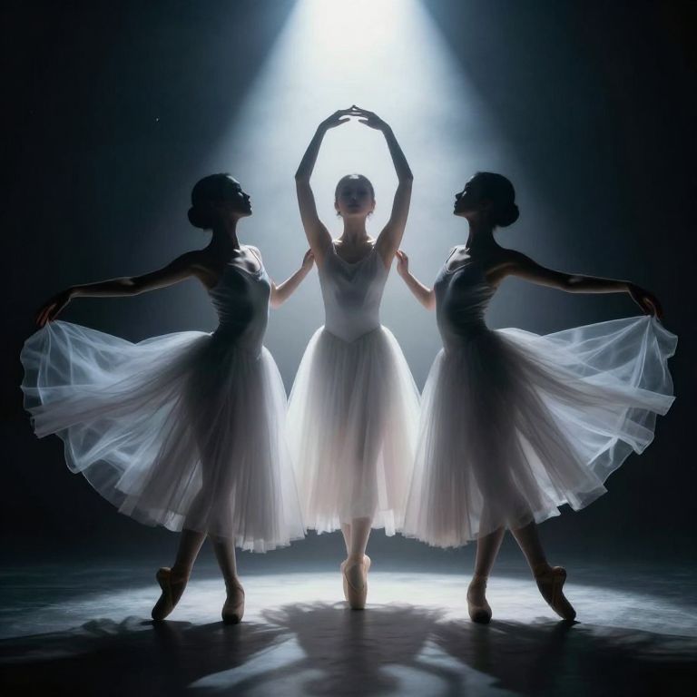 Three ethereal figures in flowing tutus stand poised against a radiant light source, their forms cloaked in shadow and mystery, as if caught in a timeless dance between reality and the unseen realms.
