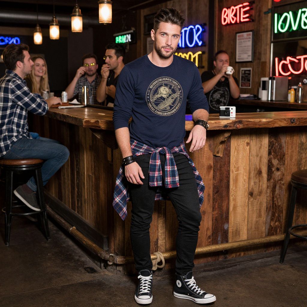 A man, graphic longline tee, black skinny jeans, high-top black sneakers, plaid flannel shirt tied around waist, leather wristband, neon signs flickering, rustic wooden bar, lively chatter, disposable camera style, relaxed expression. Man has masculine face and piercing eyes