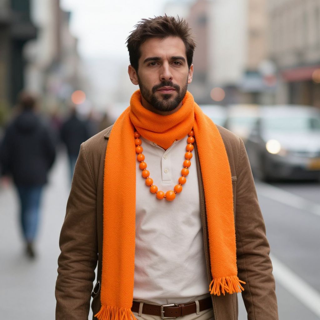 Toga Themed Costume, man with orange scarf and necklace on city street