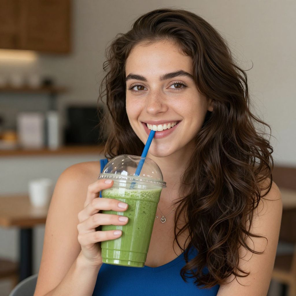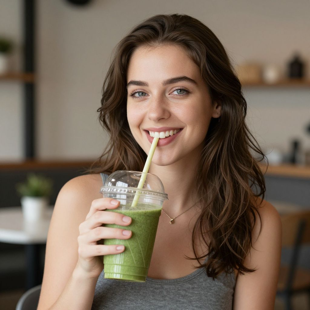 Photograph of a smiling young woman with wavy brown hair, blue eyes, and light skin, holding a green smoothie with a yellow straw,