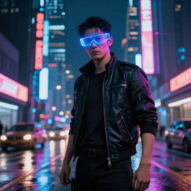 Cyberpunk street scene: Asian man with black leather jacket, neon blue visor, and black shirt stands in a neon-lit, rainy city