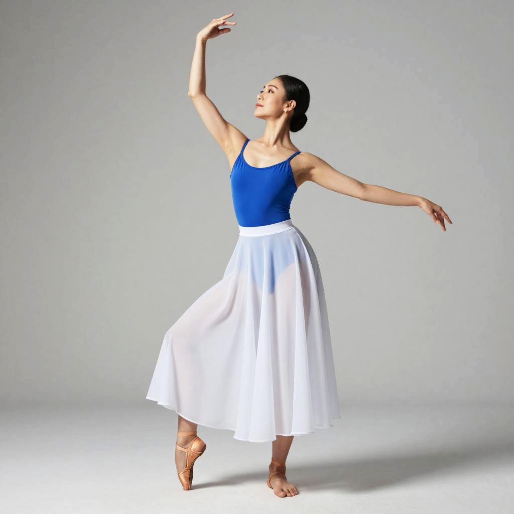 Ballet dancer in blue leotard and white skirt