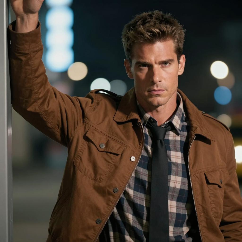 Man with short brown hair, light stubble, wearing beige pilot shirt with black stripes, leaning against the side of a blue and gray airplane. Shirt unbuttoned, right arm raised. Intense facial expression. Number "1727" visible on airplane. Daylight.