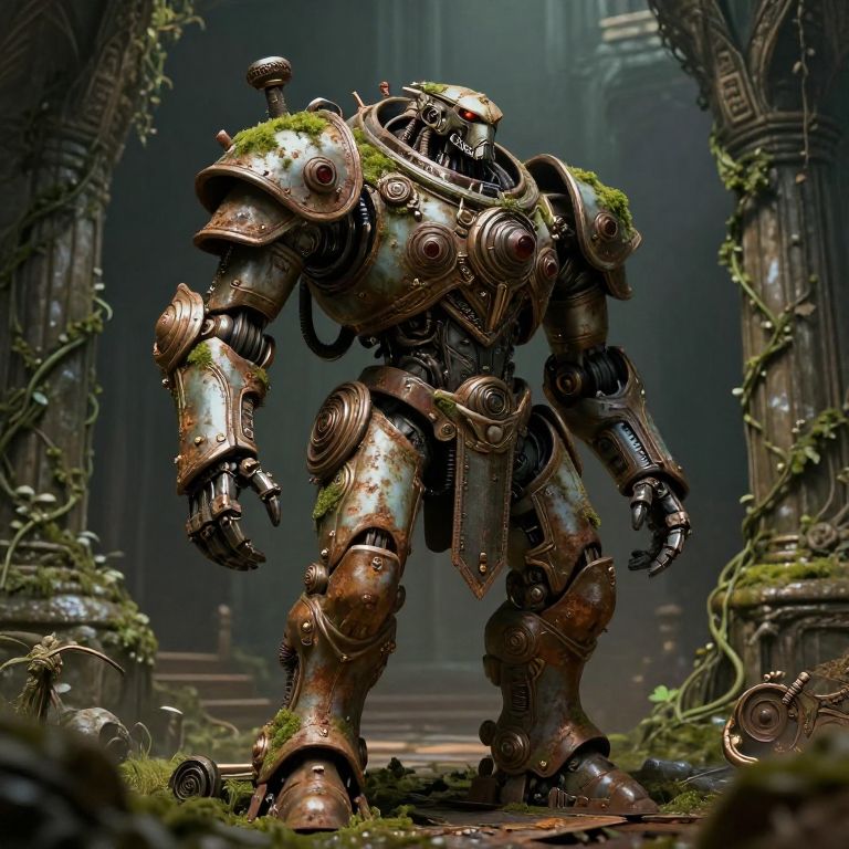 This CGI image depicts a rusted, humanoid robot standing in a decrepit, overgrown ruin. The robot's armor is heavily corroded, with patches of green moss covering its shoulders and joints. Its metallic components feature intricate, industrial designs, and its head resembles a helmet with a circular visor. The background shows crumbling stone pillars and vines creeping across the scene, with dim, atmospheric lighting suggesting an ancient, abandoned setting. The robot's stance is imposing, with its large, claw-like hands slightly raised. The overall color palette includes dark browns, greens, and metallic grays, creating a sense of decay and neglect.