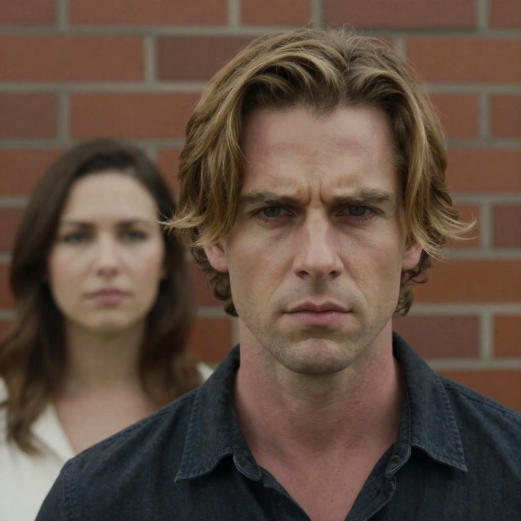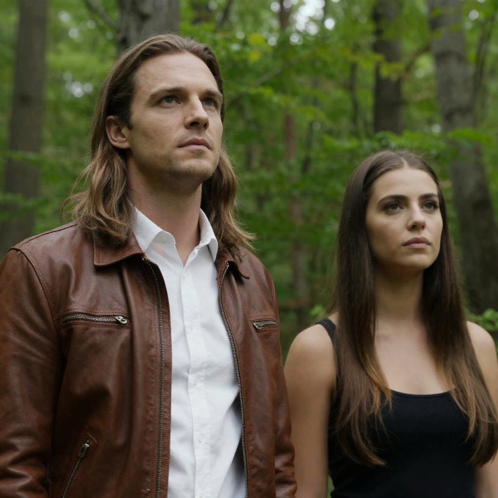 Photograph of a man and woman in a forest. Man with long brown hair, leather jacket, white shirt, looking upward. Woman with long brown hair, serious expression, looking forward. Bright green foliage background. Man on left, woman on right.
