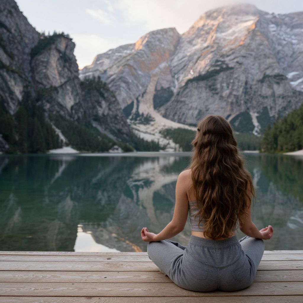 Photograph of a woman with long brown hair, sitting cross-legged on a wooden dock, meditating by a serene mountain lake with snowy peaks reflected in
