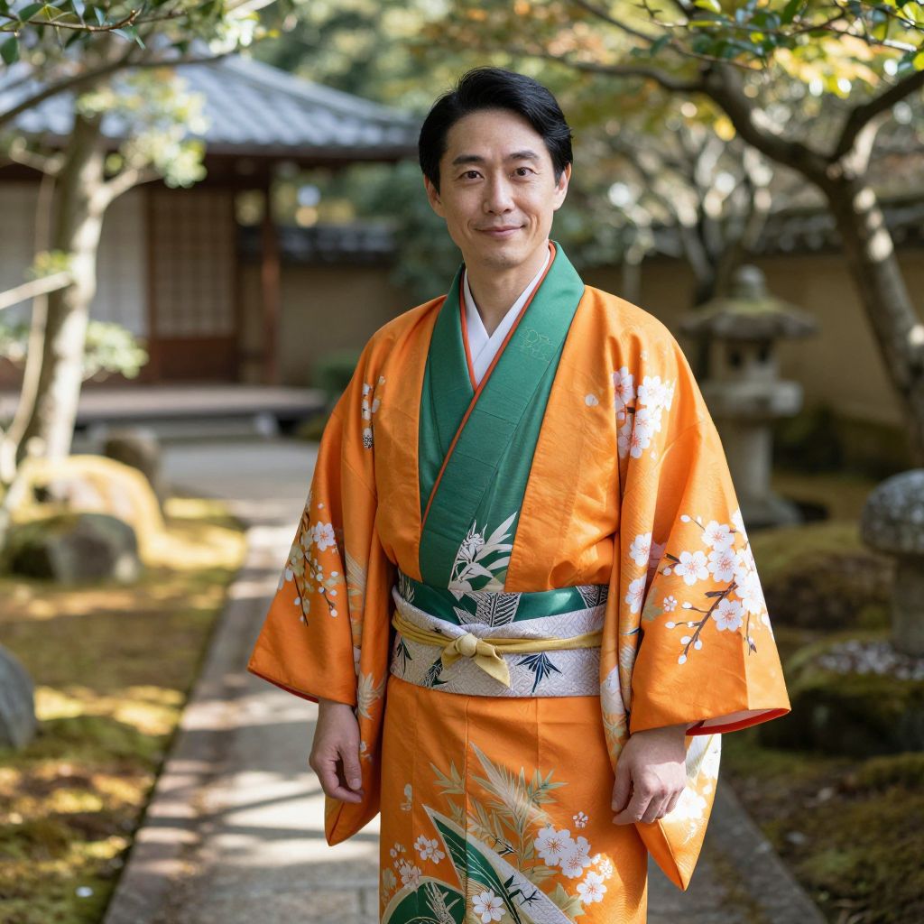 An Asian man with sleek black hair and warm, expressive eyes stands gracefully in a traditional Japanese garden setting. He wears a beautifully crafted kimono with vibrant orange and green accents, featuring intricate patterns of cherry blossoms and bamboo. The fabric flows softly around him as he smiles gently, capturing a serene and cultural atmosphere. Soft sunlight filters through the trees, casting dappled shadows on the mossy path. The scene exudes peace, elegance, and a deep connection to Japanese tradition.