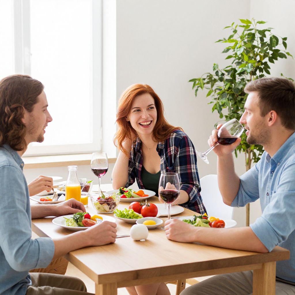 A lively photograph of four friends dining together at a wooden table in a bright, sunlit room. The man on the left in a gray shirt and beard smiles at the red-haired woman in a plaid shirt, who laughs. The man on the right in a blue shirt sips wine. The table is filled with colorful food, including salads and tomatoes. Sunlight streams through large windows in the background, and a green plant is on the right.