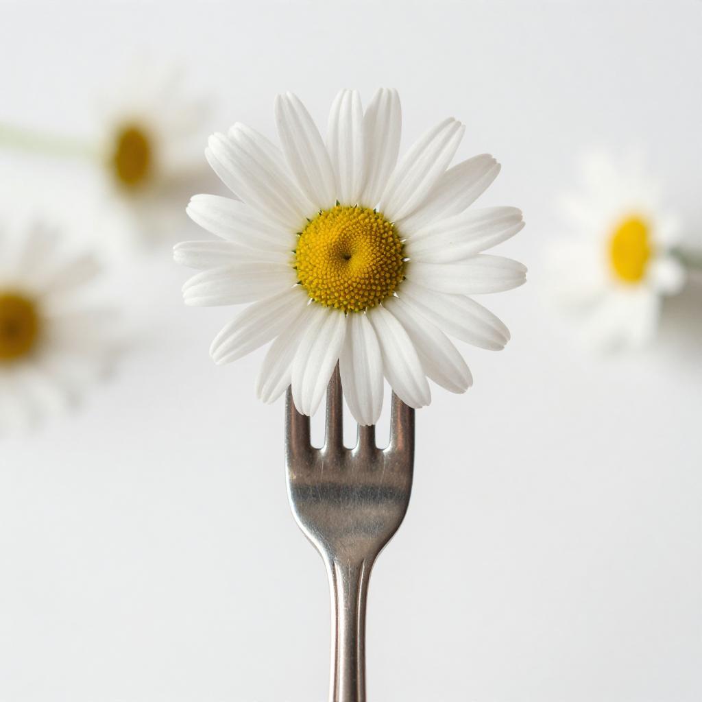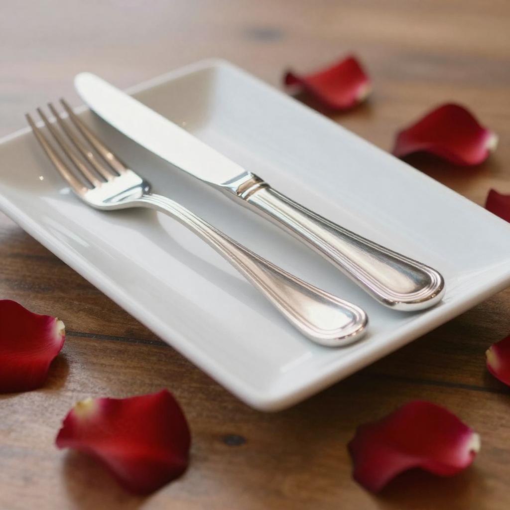 Photograph of a white square plate with shiny silver cutlery (fork and knife) and a napkin ring, placed slightly off-center. Red rose petals are scattered around the plate on a wooden table. The background is blurred, creating a shallow depth of field. The lighting is soft and natural, highlighting the metallic sheen of the cutlery. The camera angle is slightly above eye level.