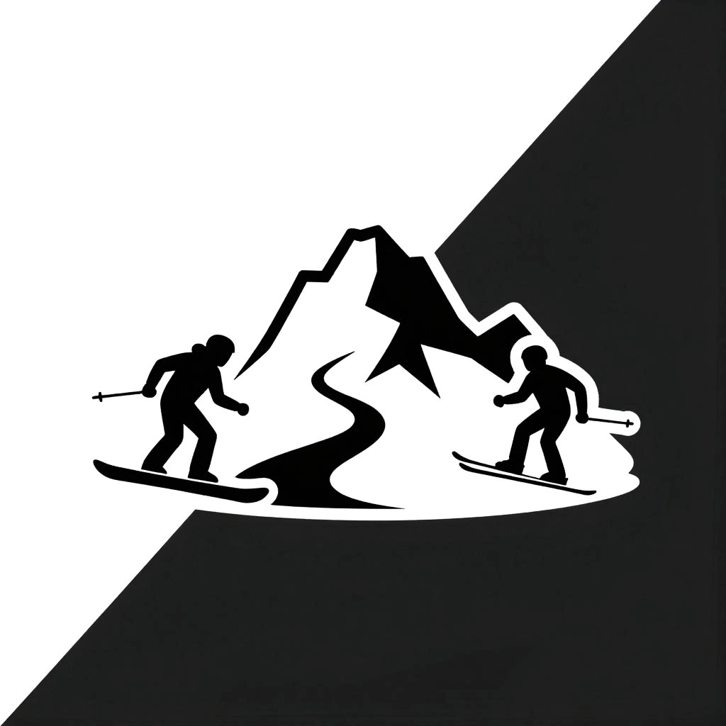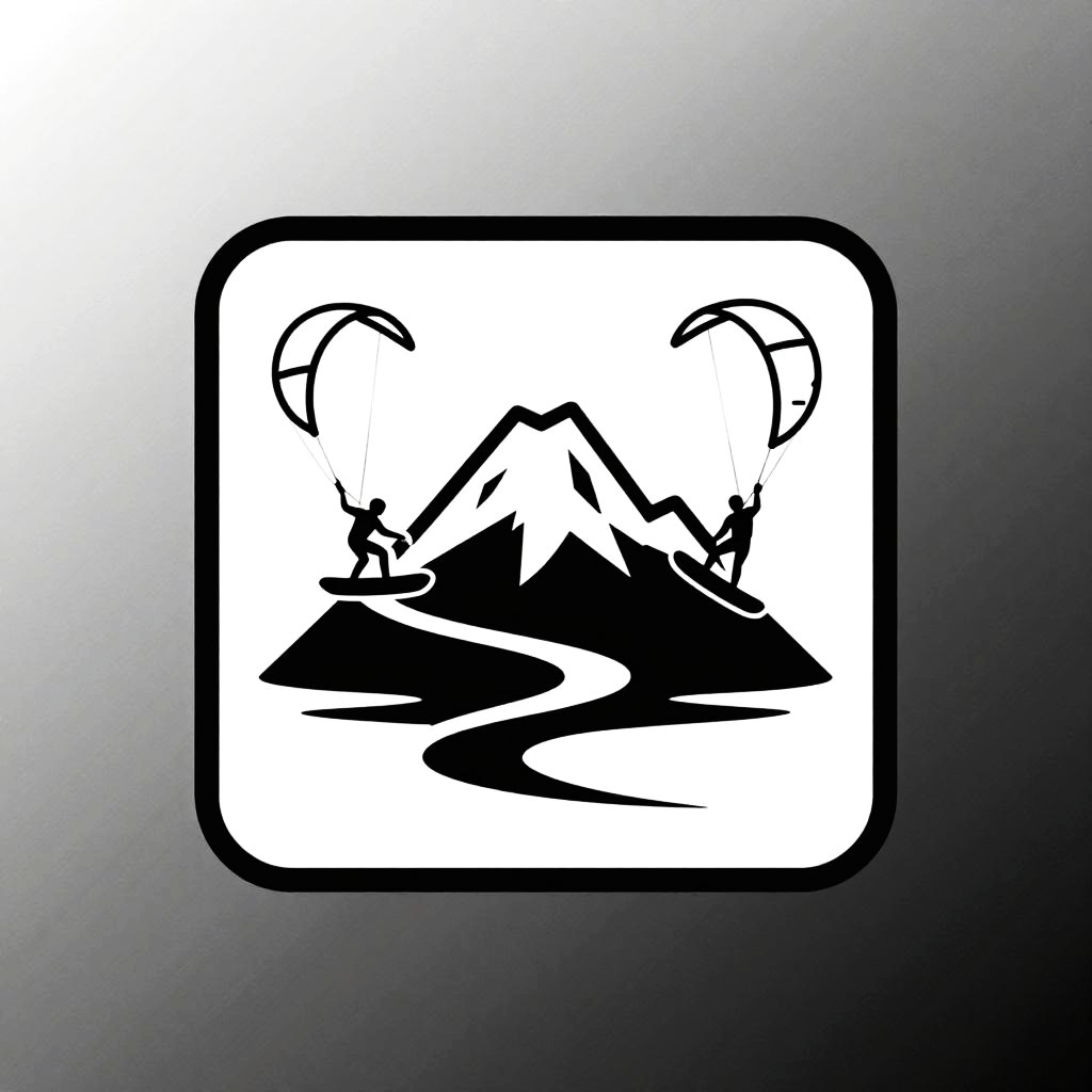 Wide-angle action shot of a logo for an app for feng shui practitioners, featuring a stylized mountain with a yin-yang symbol and bamboo ascending opposite sides, with a winding path symbolizing connection, cool black and white color scheme, recognizable and scalable for light and dark backgrounds