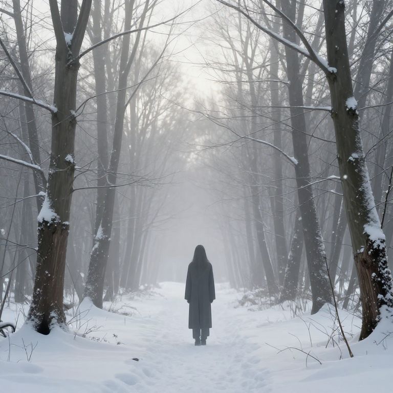 Motionless figure standing in a desolate winter forest, soft diffused light filtering through bare branches, cold muted color palette, surreal atmosphere with fog and stillness, emphasizing quiet and eerie calmness, digital art