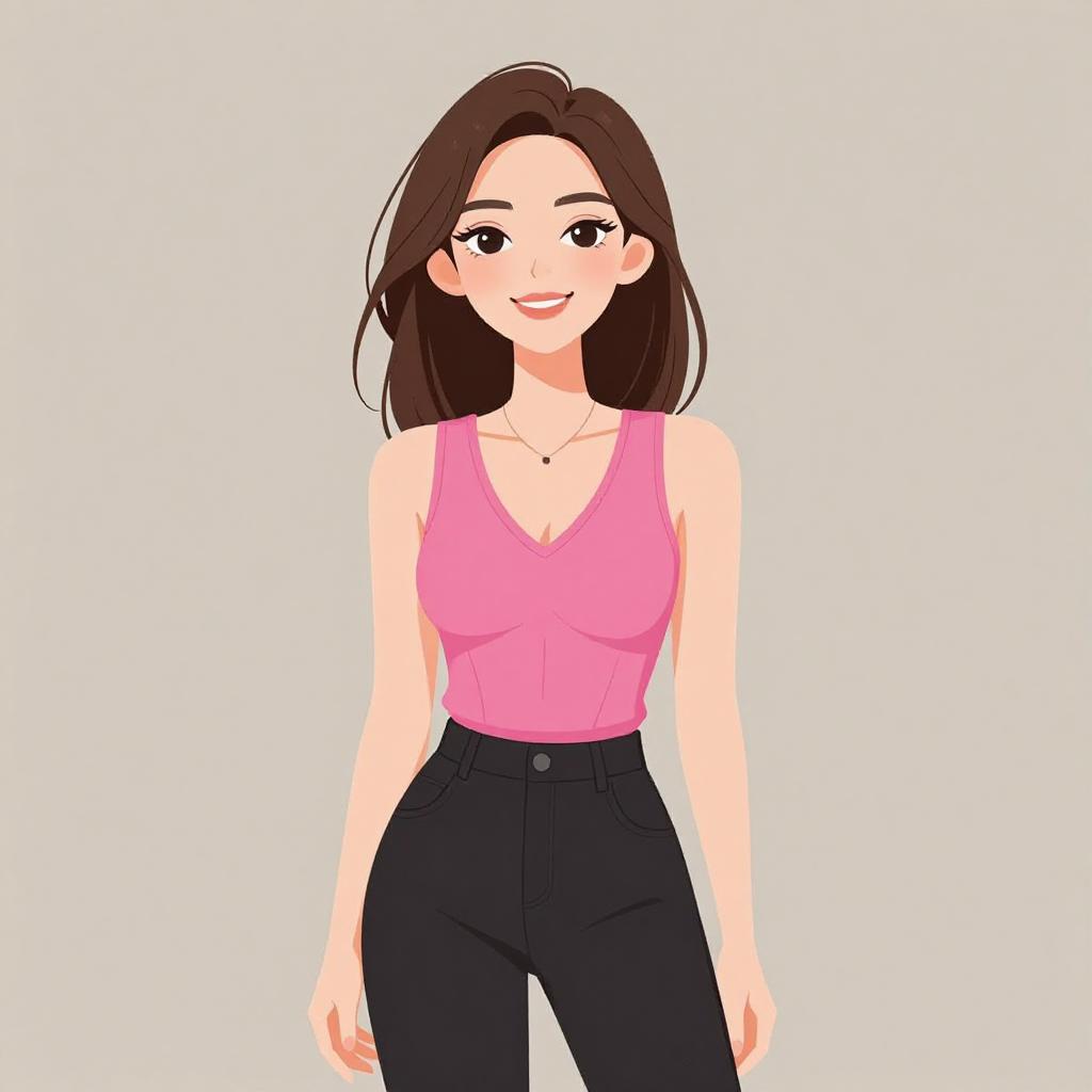 Digital illustration of a young woman with light skin and long brown hair, smiling slightly. She has large, expressive eyes and wears a pink, sleeveless, V-neck top that shows a hint of cleavage, paired with high-waisted, black pants. The background is plain white, making her the focal point. She has a slender build with a modest bust. A small, delicate necklace is visible around her neck. The art style is clean and minimalistic, with bold colors and simple shading. The woman stands confidently, facing forward with her arms relaxed by her sides.