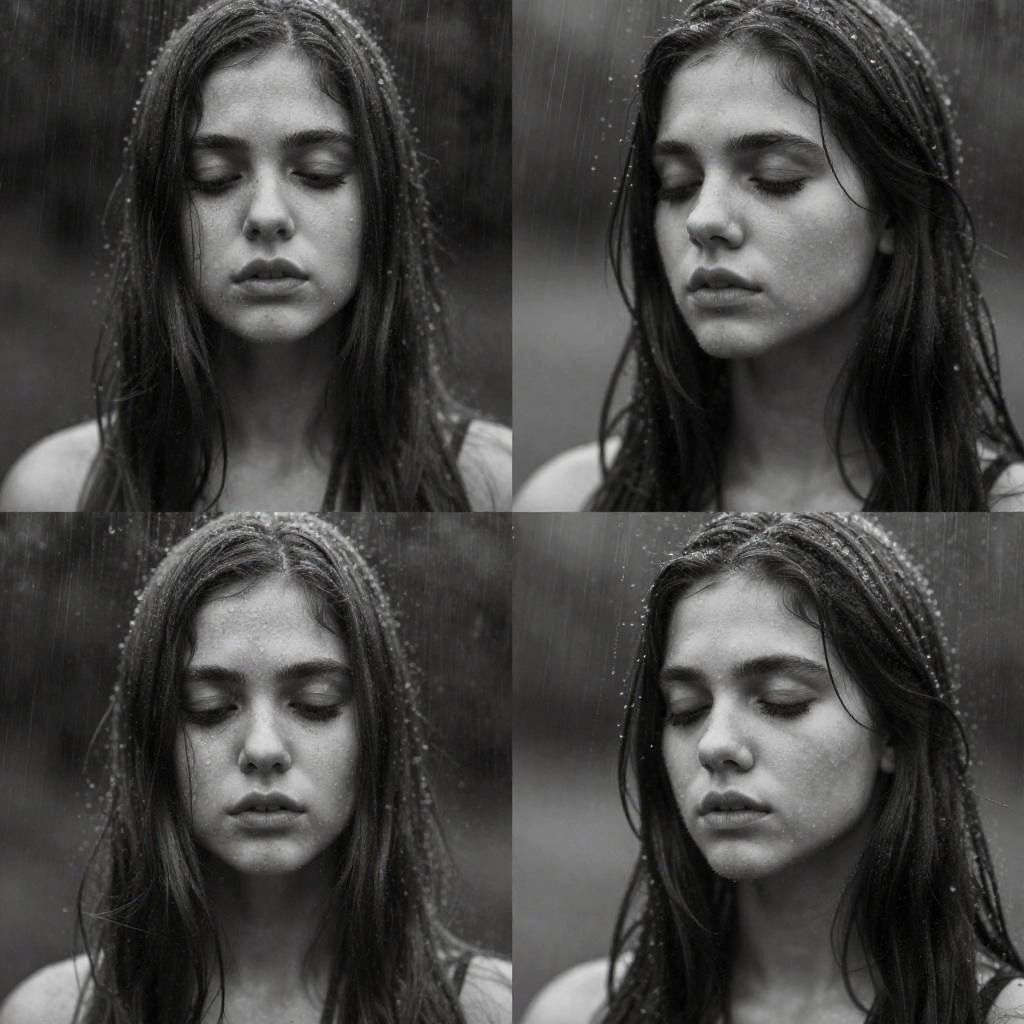 Black-and-white photograph of a young woman with wet, long dark hair and closed eyes, standing in rain; four close-up shots in a grid,