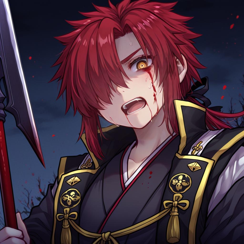 Mori nagayoshi (fate), fate (series), 1boy, sharp teeth, yellow eyes, hair over one eye, red hair, long hair, spiked hair, ponytail, blood on face, japanese clothes, japanese clothes, spear, jinbaori, by artist unime seaflower, dark_illustrious